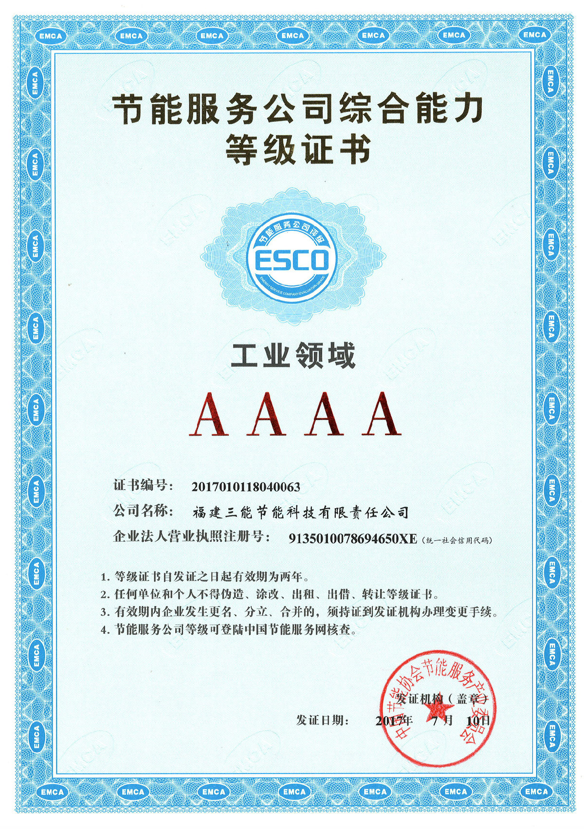 我司经过中国节能协会节能服务产业委员会的专家评审、核查和公示,在全国节能服务公司综合能力评鉴上,获得工业领域“AAAA”证书。
